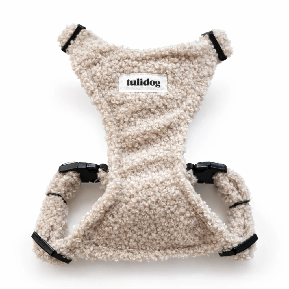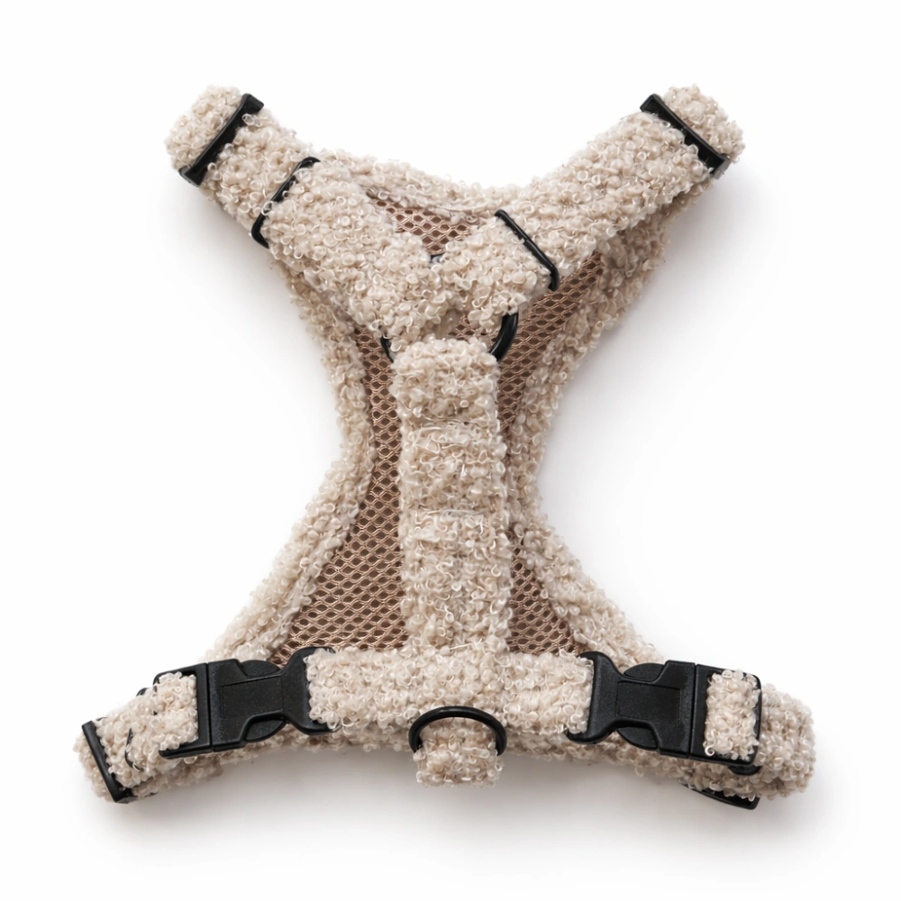 Dzięki obszyciu z delikatnego materiału bouclé Twój pupil wygląda, jakby właśnie wybierał się na wybieg… albo przynajmniej na elegancki spacer do ulubionego parku.